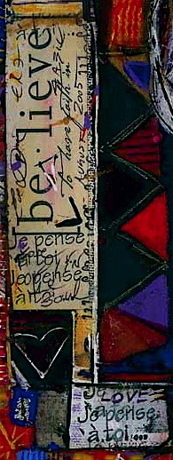 Medium: Acrylic, permanent ink, collage, on canvas with archival varnish.