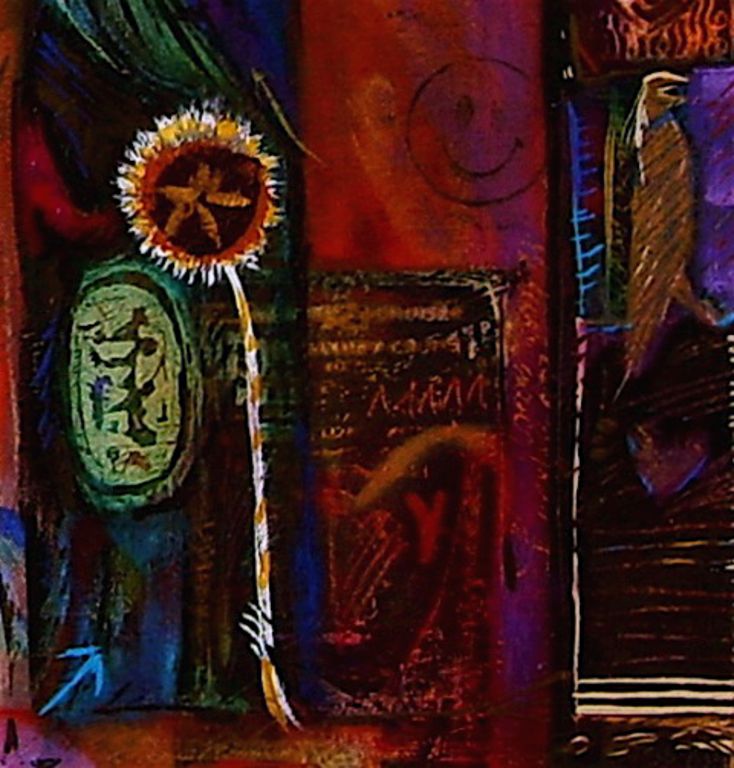 This mixed media painting can hang on a WALL in a graphic frame; without a frame, since its sides are decorated; on a decorative support; or in a shadow box.