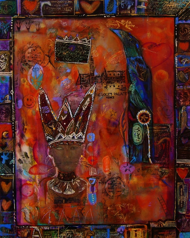 Medium: acrylic and permanent ink on wood with collage elements (photographic transfer on canvas) and archival varnish.