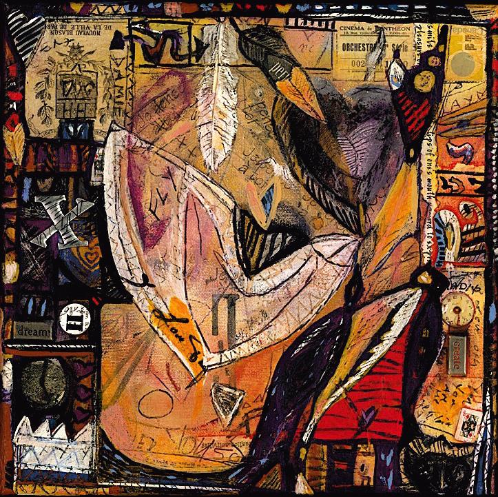 Medium: Acrylic, permanent ink, collage, on canvas with archival varnish.
