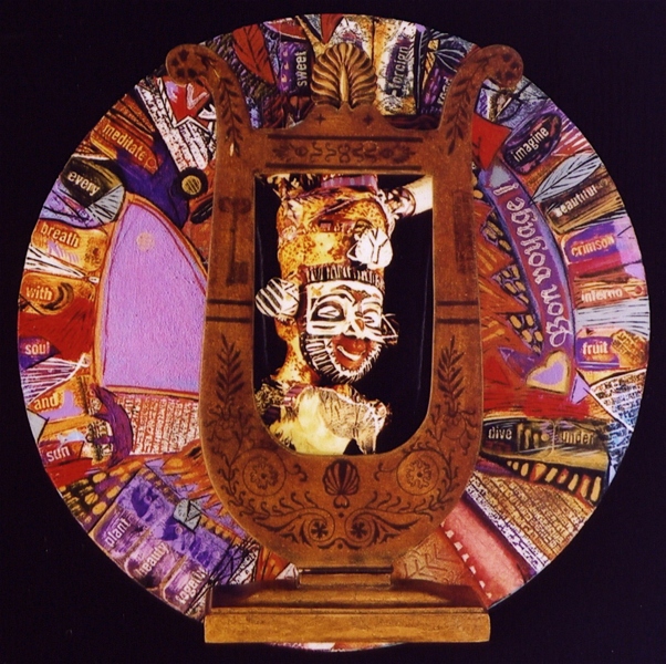 Medium: acrylic on wood with collage elements, (a wooden framed photograph and metal fragments) archival varnish.