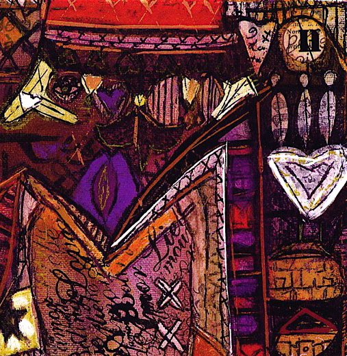Medium: Acrylic, permanent ink, collage, on canvas with archival varnish