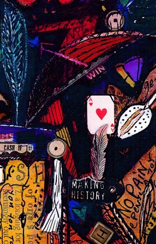 Medium: Acrylic, permanent ink, collage, on canvas with archival varnish.