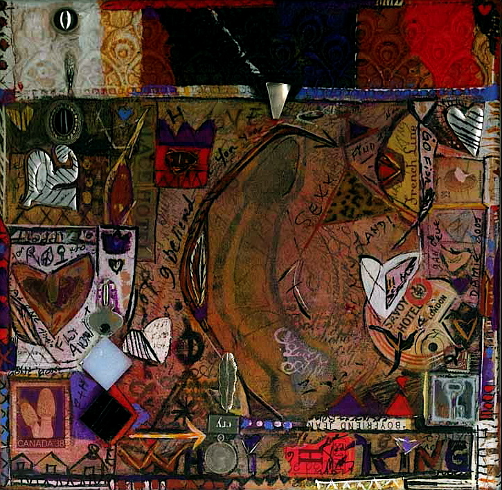 Medium: Acrylic, permanent ink, collage, on canvas with archival varnish