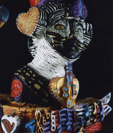 Medium: acrylic on/with objects, wood, rubber, plastic, metal and archival varnish. The bust of Nefertiti is of resin plastic and other compounds. This work is a painted sculpture (3-dimensional assemblage).