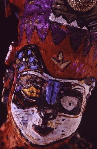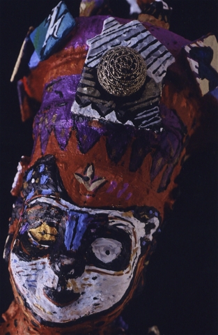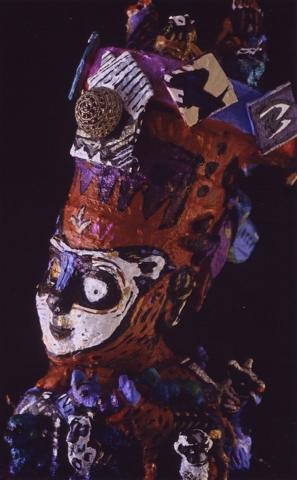 Medium: acrylic on/with objects, wood, rubber, plastic, metal (mosaics) and archival varnish. The bust of Nefertiti is of resin plastic and other compounds. This painted sculpture (3-dimensional assemblage) can be showcased on a sculpture stand, podium, shelf, or inside a glass case.