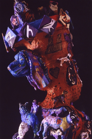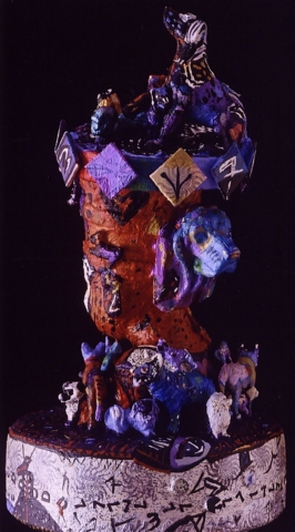Medium: acrylic on/with objects, wood, rubber, plastic, metal (mosaics) and archival varnish. The bust of Nefertiti is of resin plastic and other compounds. This painted sculpture (3-dimensional assemblage) can be showcased on a sculpture stand, podium, shelf, or inside a glass case.