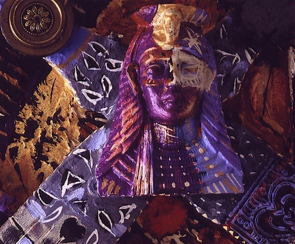 Medium: acrylic on/with objects, wood, rubber, plastic, metal and archival varnish. The head of Nefertiti is of resin plastic and other compounds.