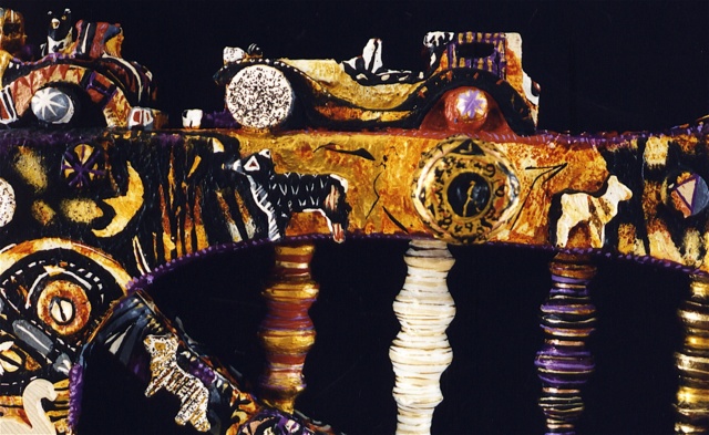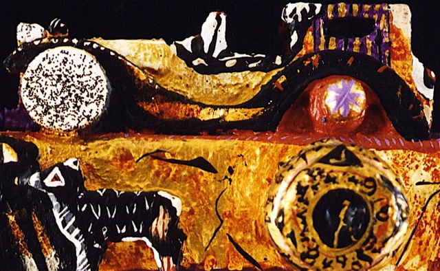 Medium: acrylic on/with objects, wood, rubber, plastic, metal and archival varnish.