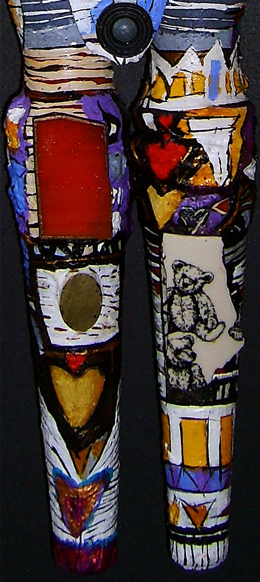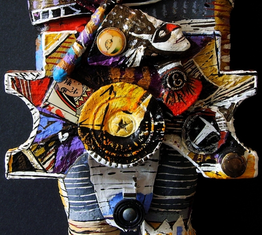 Medium: acrylic on/with objects, wood, rubber, plastic, metal and archival varnish. The head of Nefertiti is of resin plastic and other compounds. This sculptural painting (2-dimensional assemblage) can hang on a WALL, decorative support, graphic frame, or in a shadow box.