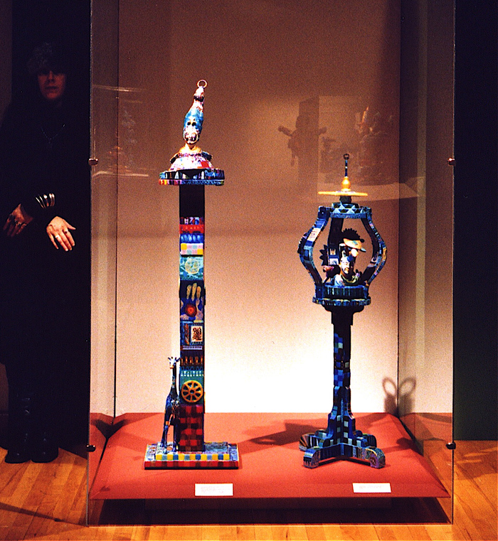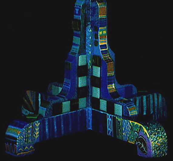 Medium: acrylic on/with objects, wood, rubber, plastic, metal (mosaics) and archival varnish. The bust of Nefertiti is of resin plastic and other compounds. This painted sculpture (3-dimensional assemblage) can be showcased on a sculpture stand, podium, shelf, or inside a glass case.