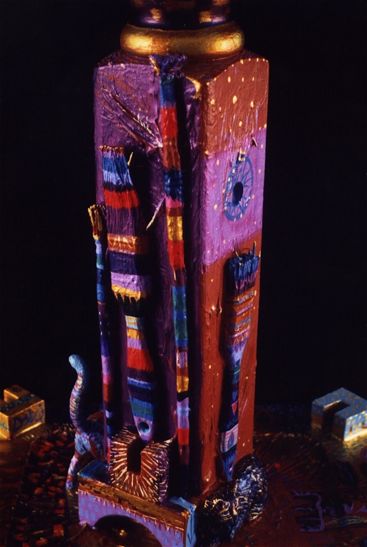 Medium: acrylic on/with objects, wood, rubber, plastic, metal and archival varnish. The bust of Nefertiti is of resin plastic and other compounds. This painted sculpture (3-dimensional assemblage) can be showcased on a sculpture stand, podium, shelf, or inside a glass case.