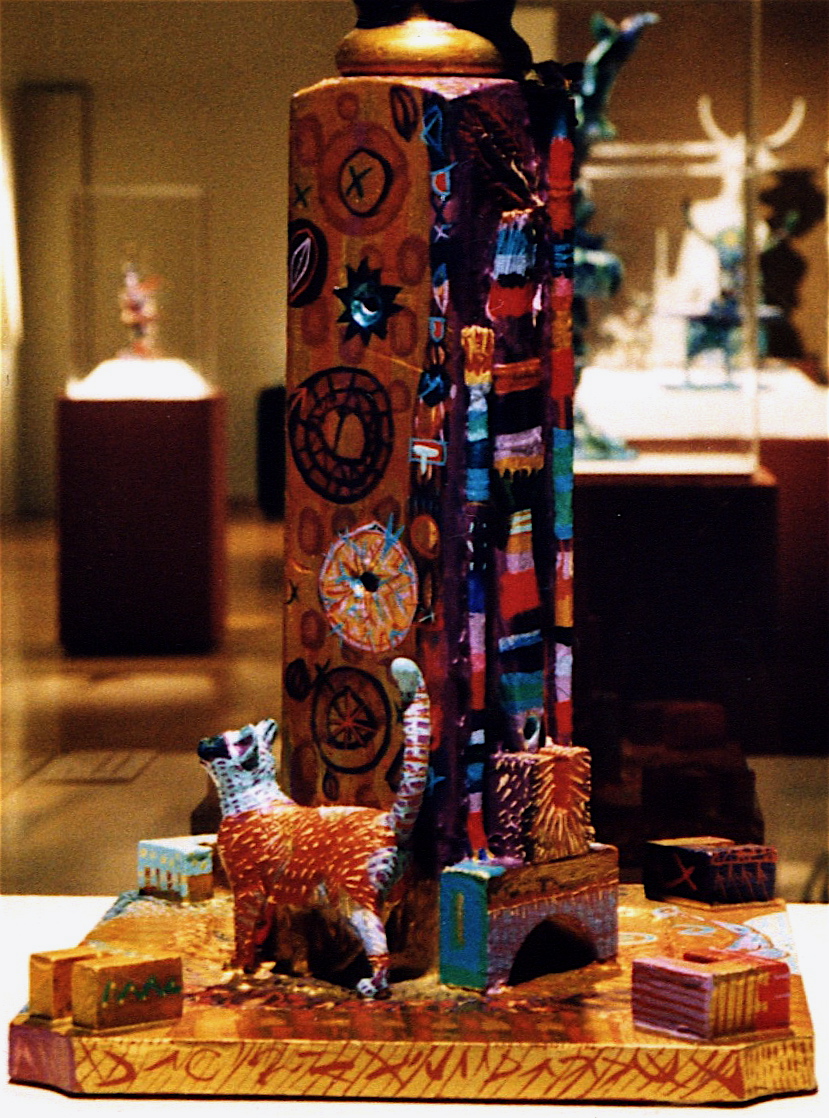 Medium: acrylic on/with objects, wood, rubber, plastic, metal and archival varnish. The bust of Nefertiti is of resin plastic and other compounds. This painted sculpture (3-dimensional assemblage) can be showcased on a sculpture stand, podium, shelf, or inside a glass case.
