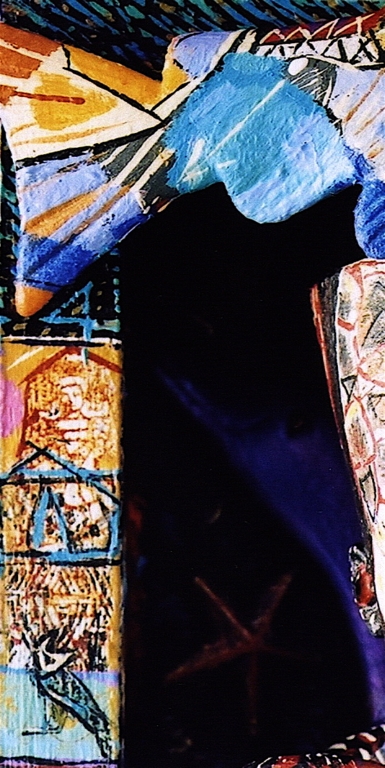 This sculptural painting (2-dimensional assemblage) hangs on a WALL, its sides are decorated.