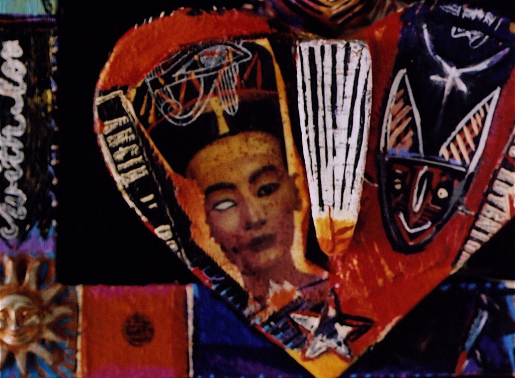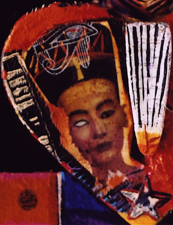 Medium: acrylic and permanent ink on wood with archival varnish. Collage elements (photographic transfer on canvas). Objects made of: wood, rubber, plastic and metal. The head of Nefertiti is of resin plastic and other compounds.