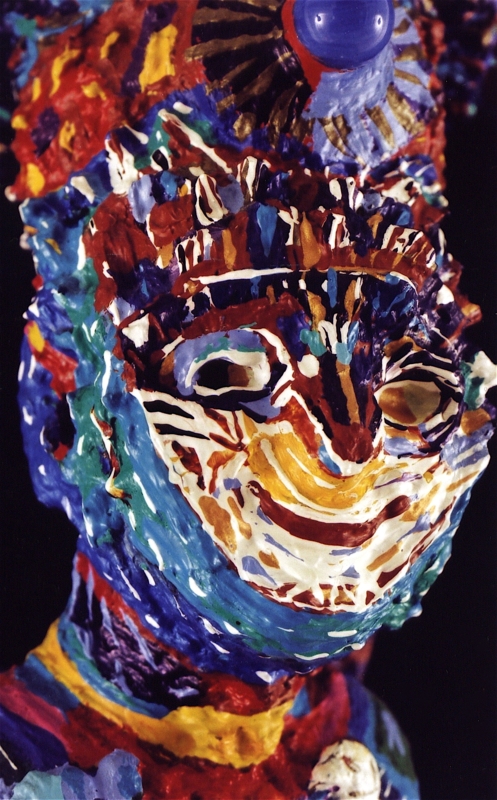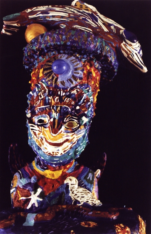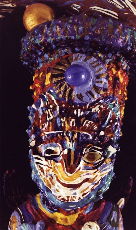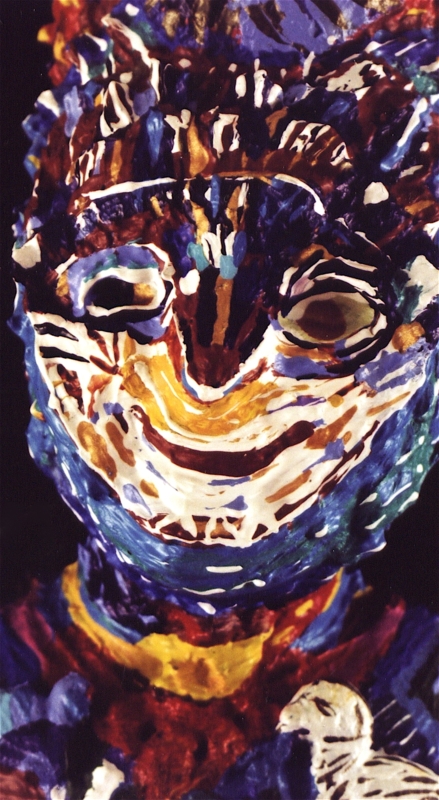 Medium: acrylic on/with objects, wood, rubber, plastic, metal (mosaics) and archival varnish. The bust of Nefertiti is of resin plastic and other compounds. This painted sculpture (3-dimensional assemblage) can be showcased on a sculpture stand, podium, shelf, or inside a glass case.