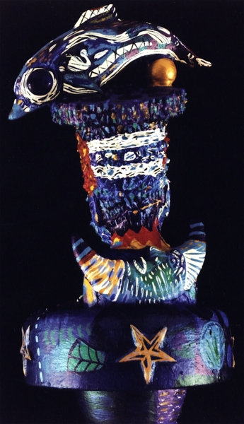 Medium: acrylic on/with objects, wood, rubber, plastic, metal (mosaics) and archival varnish. The bust of Nefertiti is of resin plastic and other compounds. This painted sculpture (3-dimensional assemblage) can be showcased on a sculpture stand, podium, shelf, or inside a glass case.