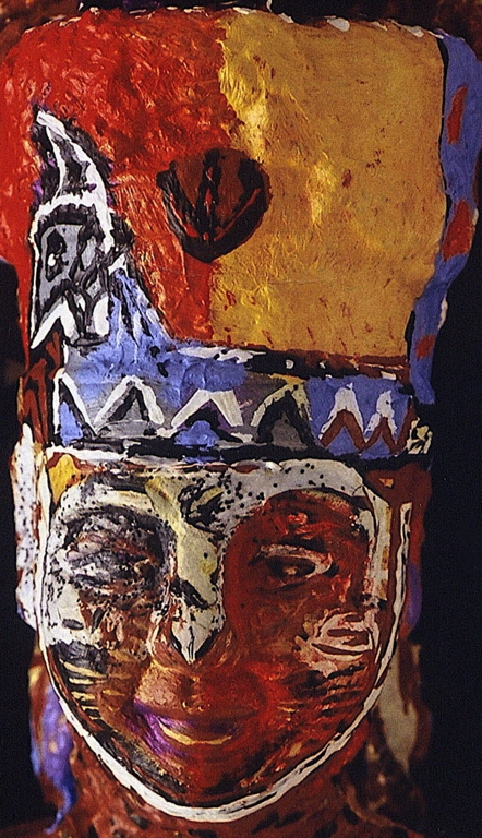 Medium: acrylic on/with objects, wood, rubber, plastic, metal and archival varnish. The head of Nefertiti is of resin plastic and other compounds. This sculptural painting (2-dimensional assemblage) is a Functional Mirror that hangs on a WALL.