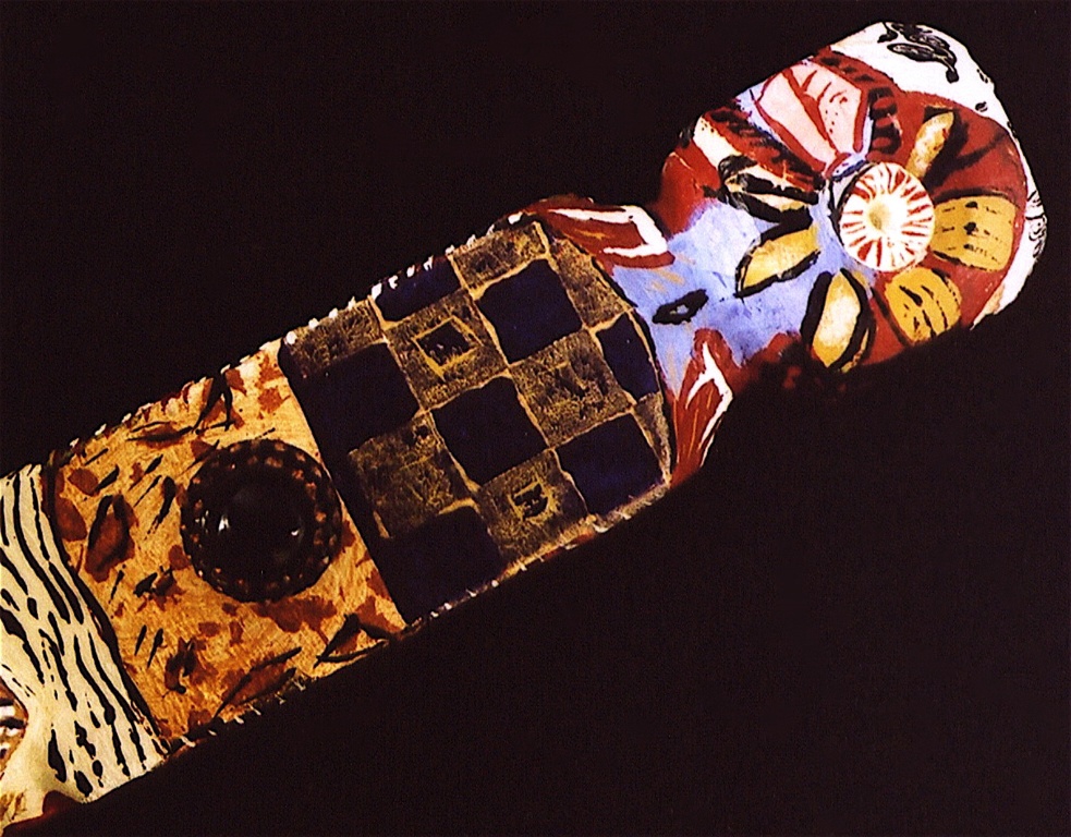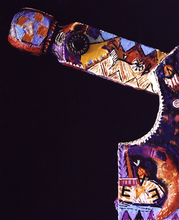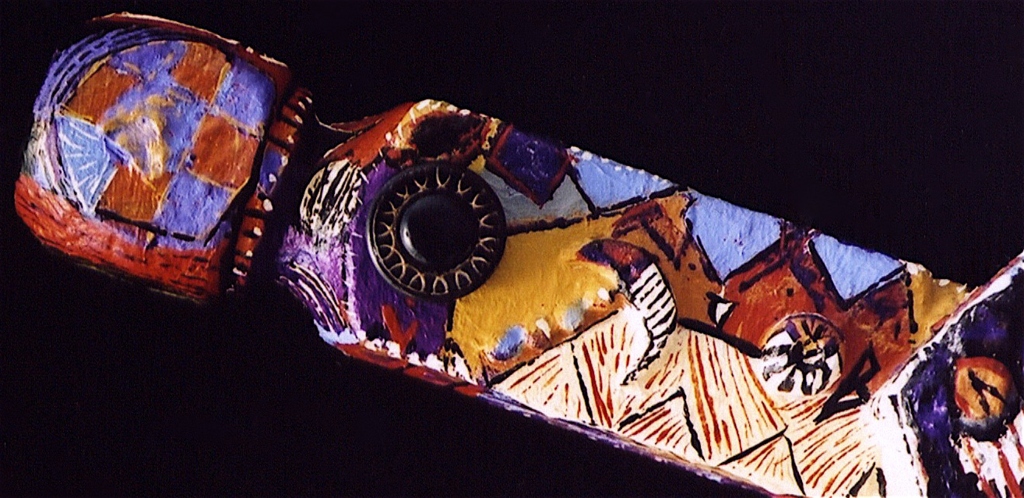 Medium: acrylic on/with objects, wood, rubber, plastic, metal and archival varnish. The head of Nefertiti is of resin plastic and other compounds. This sculptural painting (2-dimensional assemblage Figure) can hang on a WALL, decorative support, graphic frame, or in a shadow box.