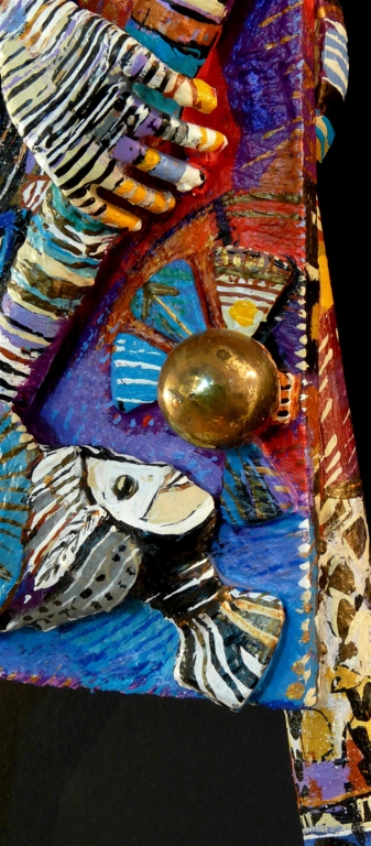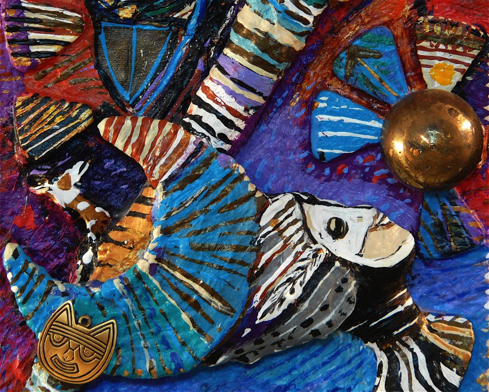 Medium: acrylic on/with objects, wood, rubber, plastic, metal and archival varnish. The head of Nefertiti is of resin plastic and other compounds. This sculptural painting (2-dimensional assemblage) can hang on a WALL, decorative support, graphic frame, or in a shadow box.