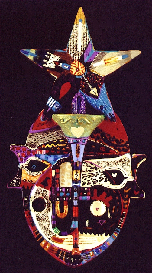 This sculptural painting (2-dimensional assemblage Mask) hangs on the wall.
